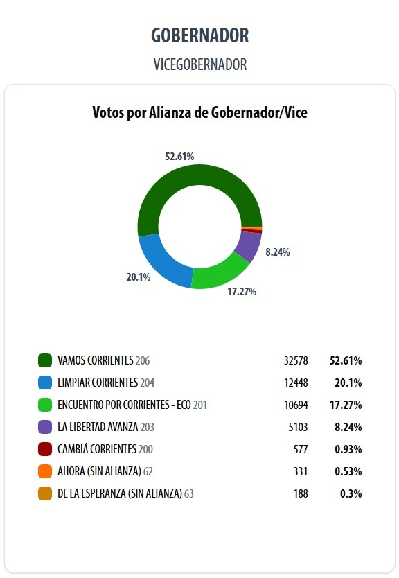 El candidato de Vamos Corrientes, Juan Pablo Valdés, se impuso con el 52.61% de los votos en las elecciones a gobernador de Corrientes, con el 11,22% de las mesas escrutadas. Lo más llamativo es el resultado del candidato de La Libertad Avanza, Lisandro Almirón, quien quedó en el cuarto lugar con apenas el 8% de los votos.